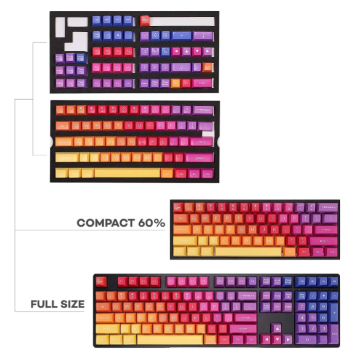 - 108-key set – Works with full-size, TKL, or 60% keyboards